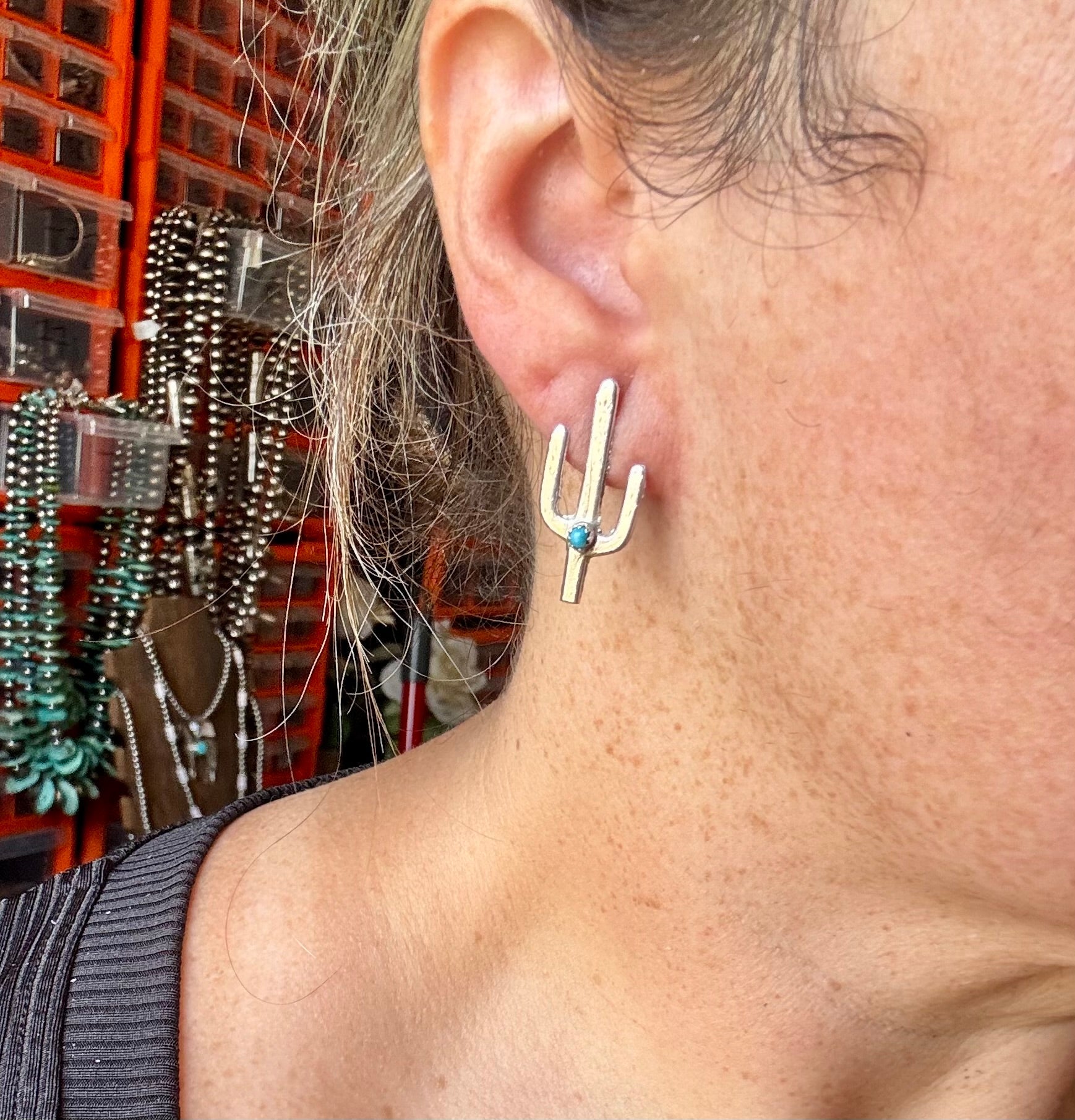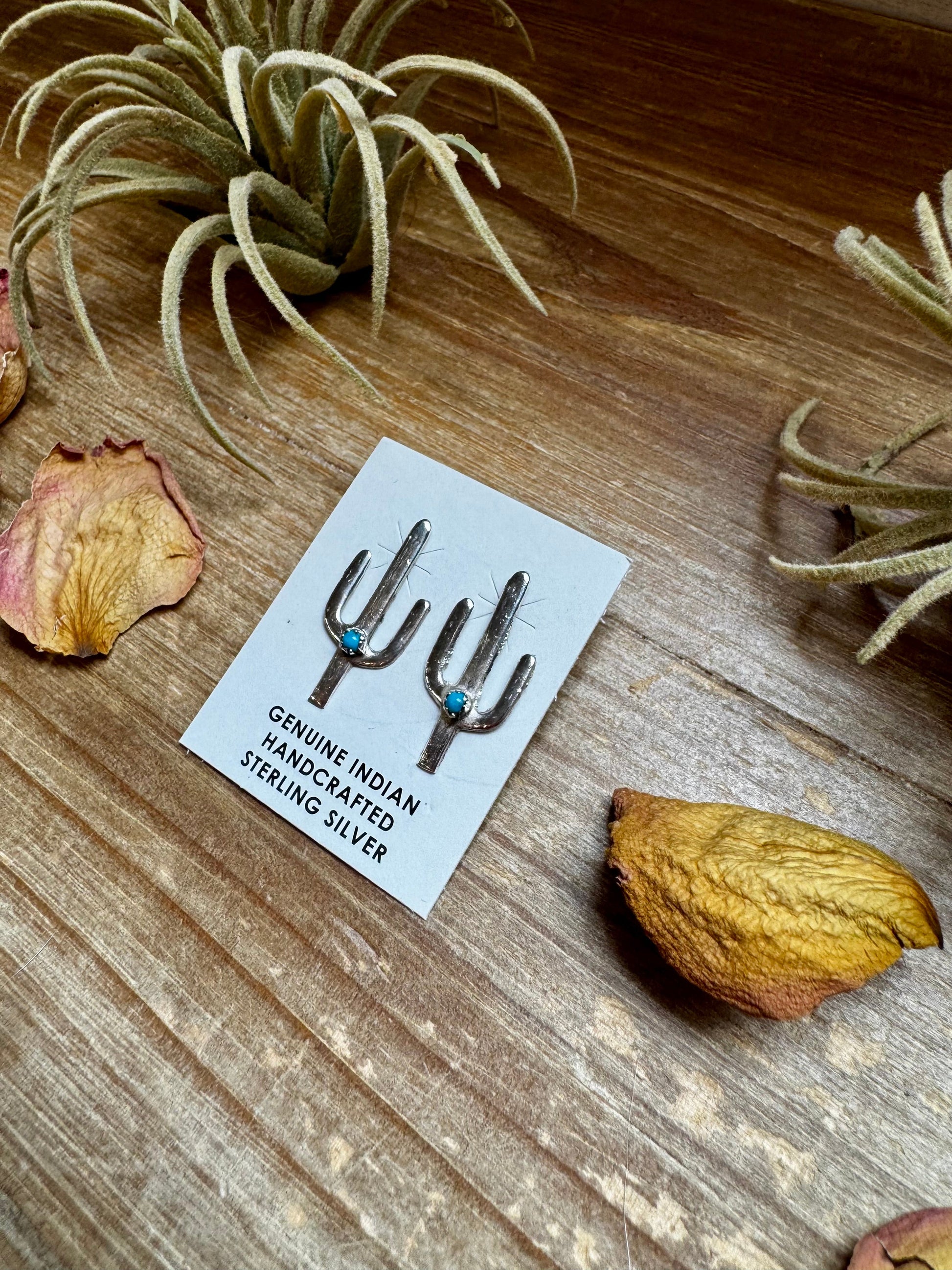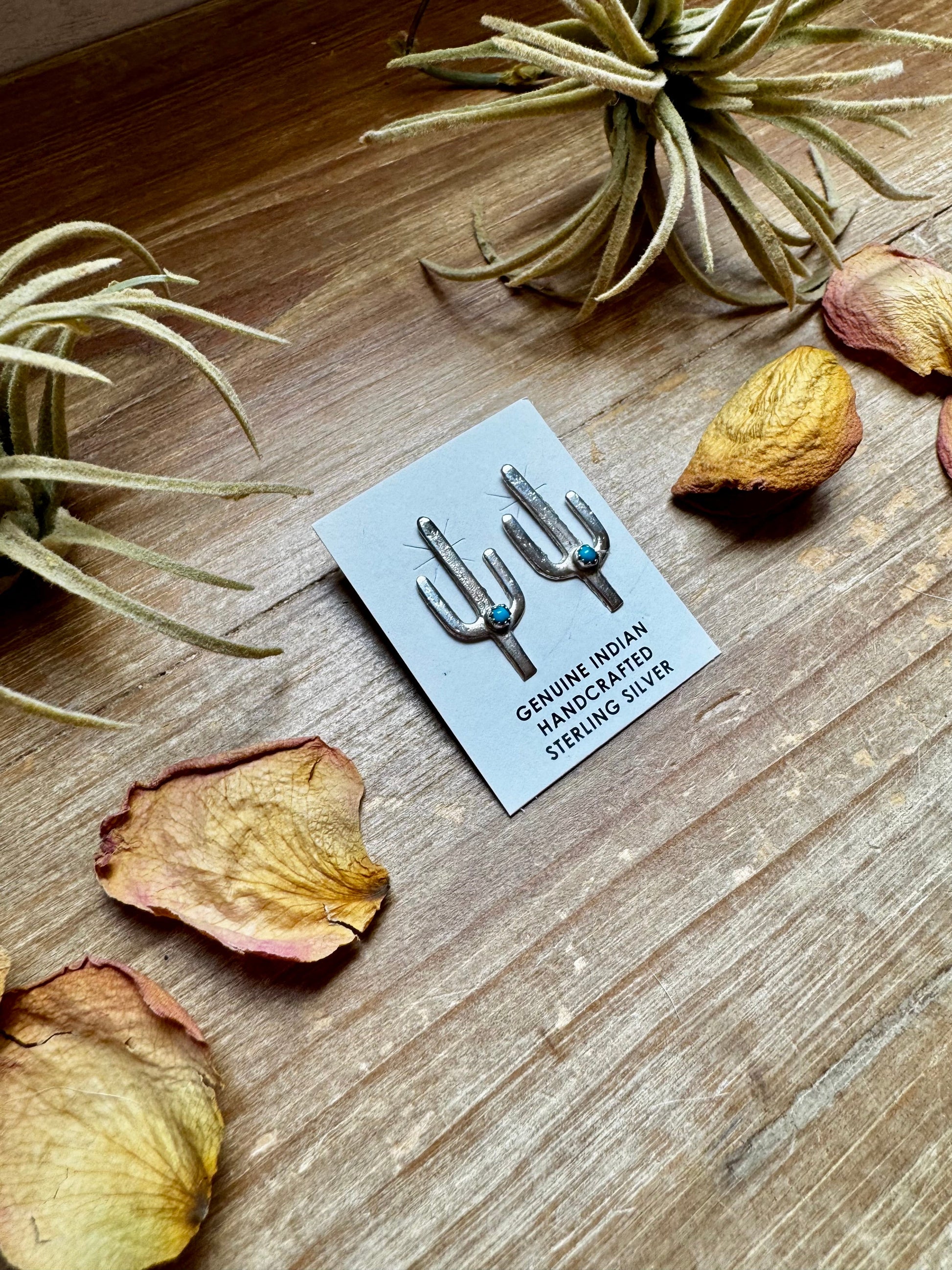 Cactus Stud Earrings – Sterling Silver with Kingman Turquoise, Native Made