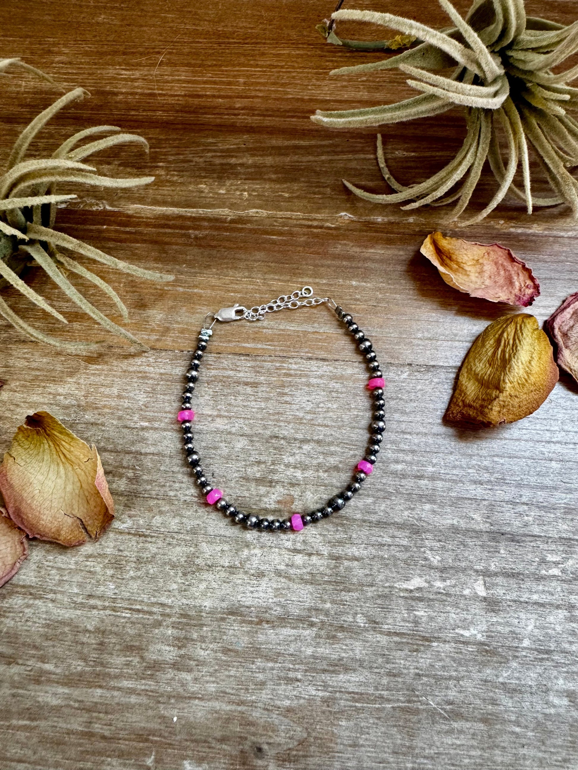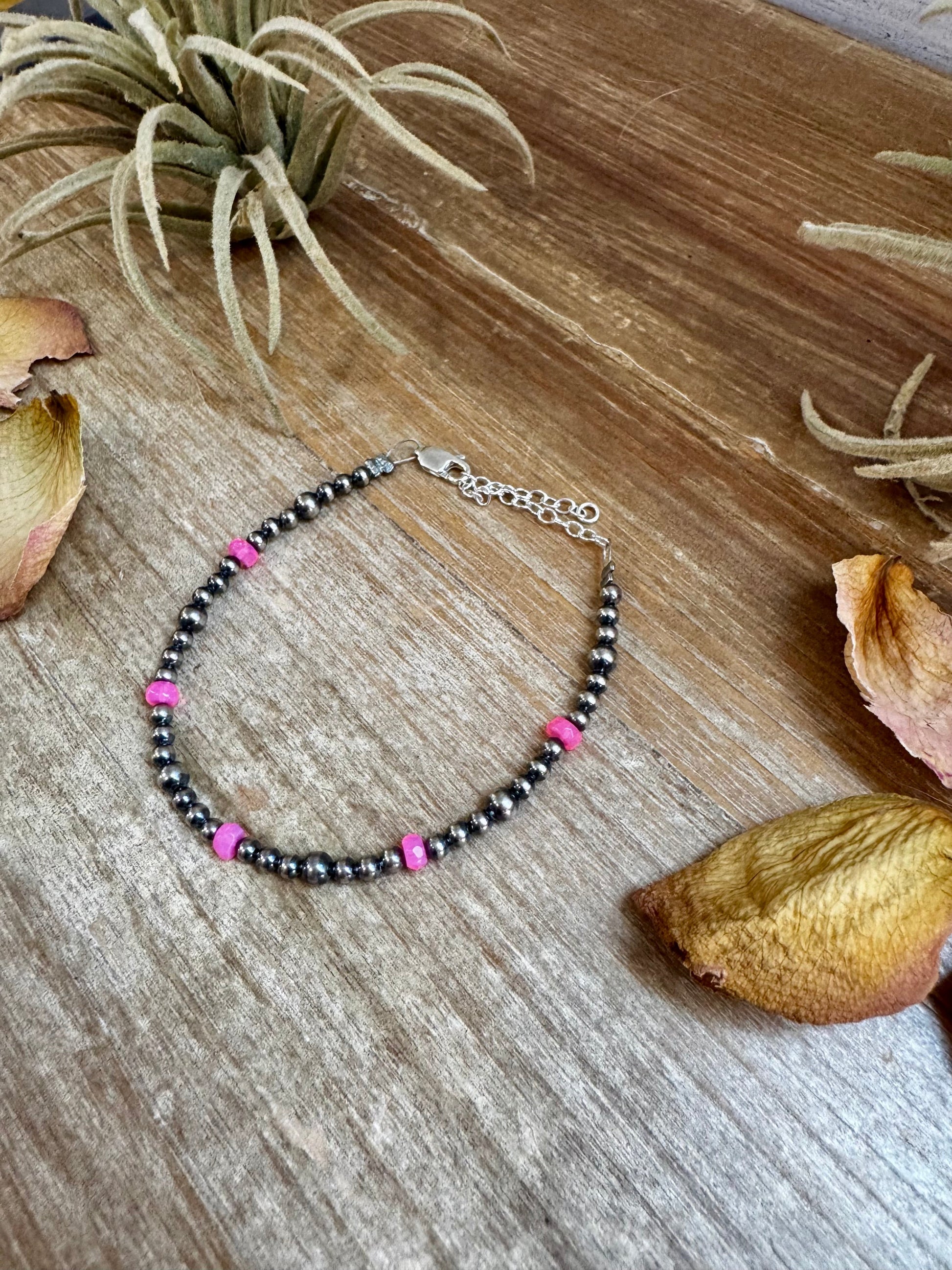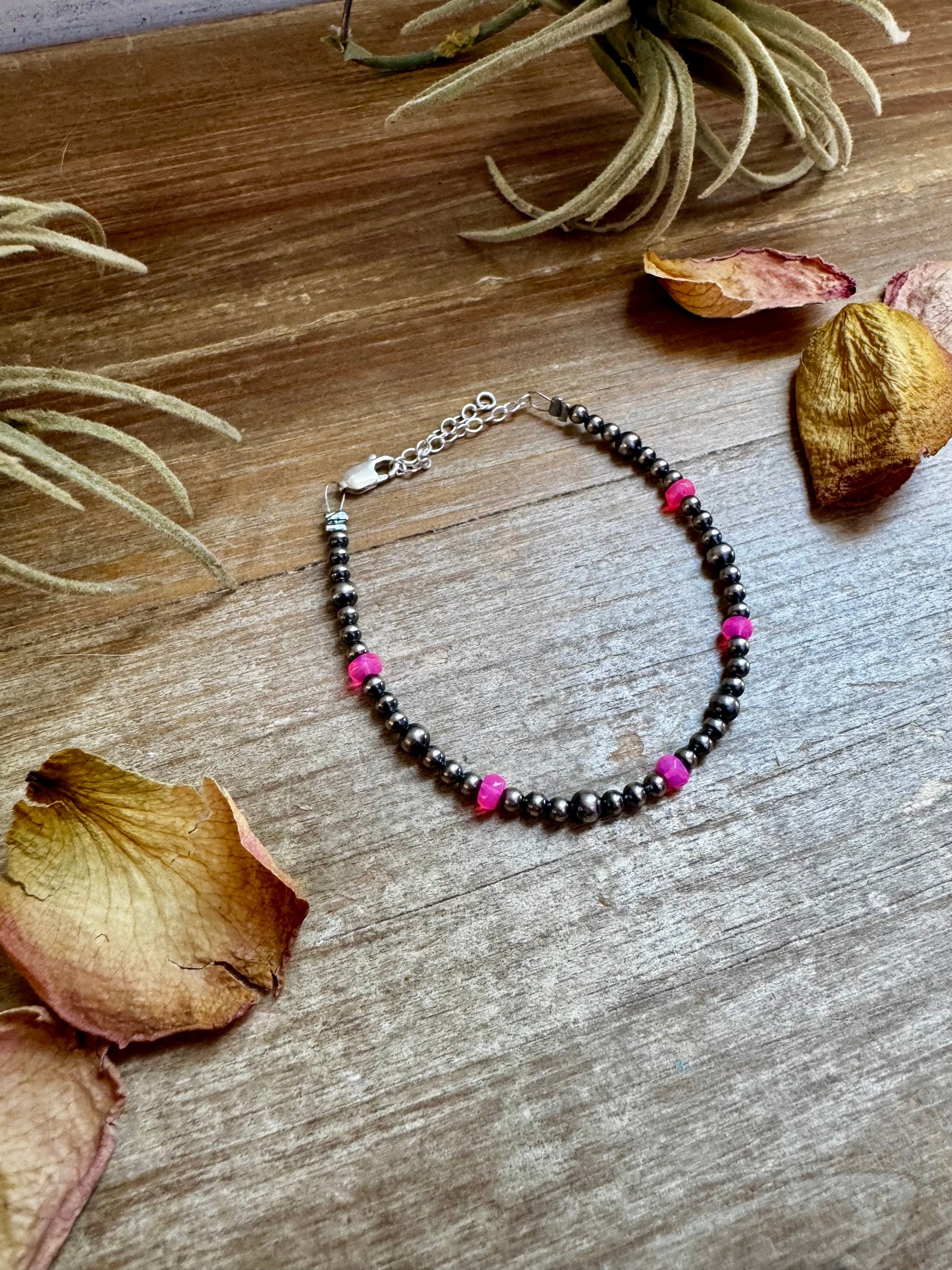 Pink, feminine, and full of glow. This 6 ¼ inch bracelet is handmade by The Bijoux FAB using 6mm pink opal beads and 3–4mm sterling silver pearls. Each pink opal is naturally unique in hue and pattern, making every bracelet one of a kind.
