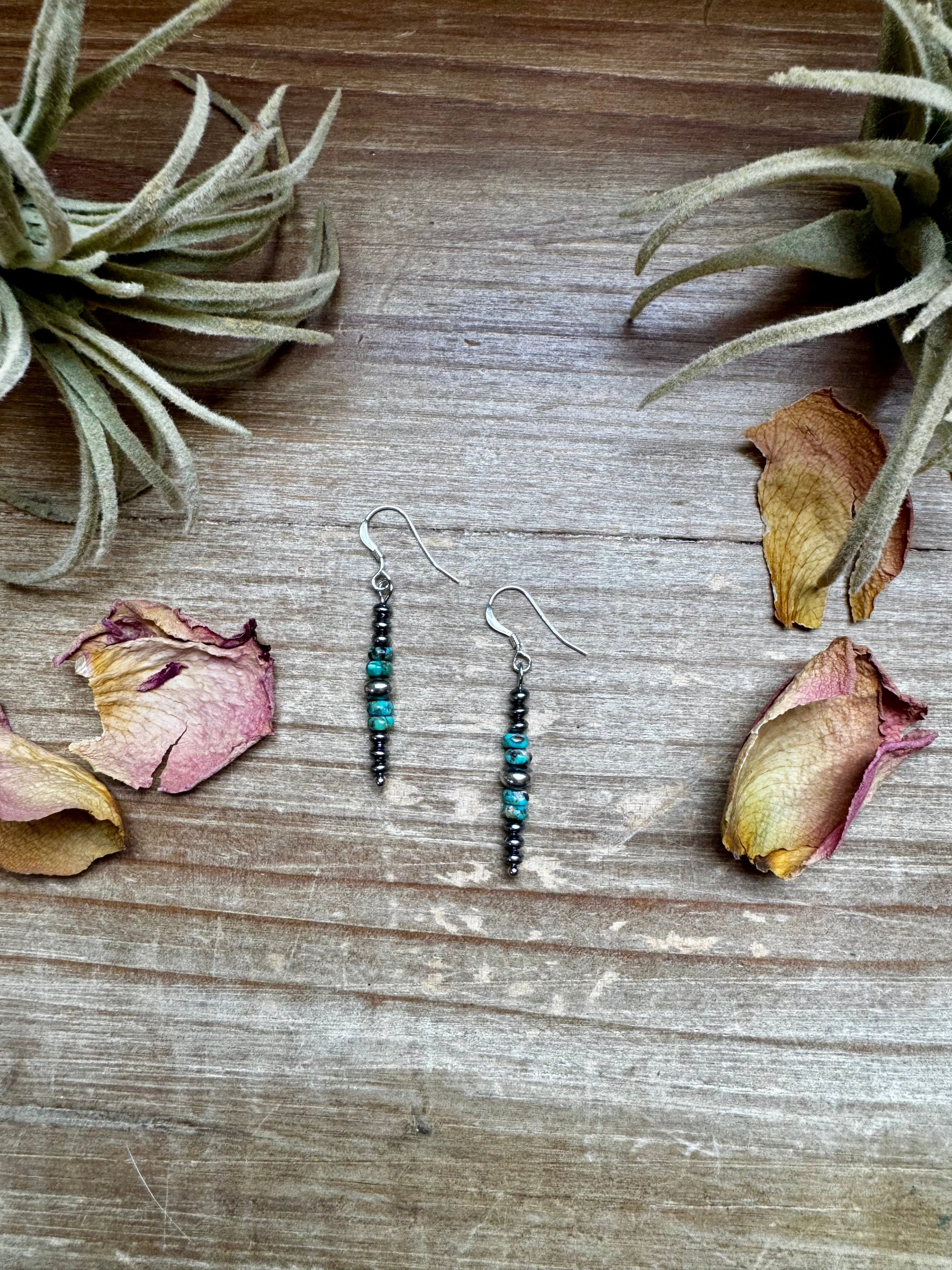 These lightweight earrings are handmade by us in North Texas using genuine 4mm turquoise rondelles paired with 3mm and 6mm sterling silver saucer beads, finished with sterling silver hooks.
